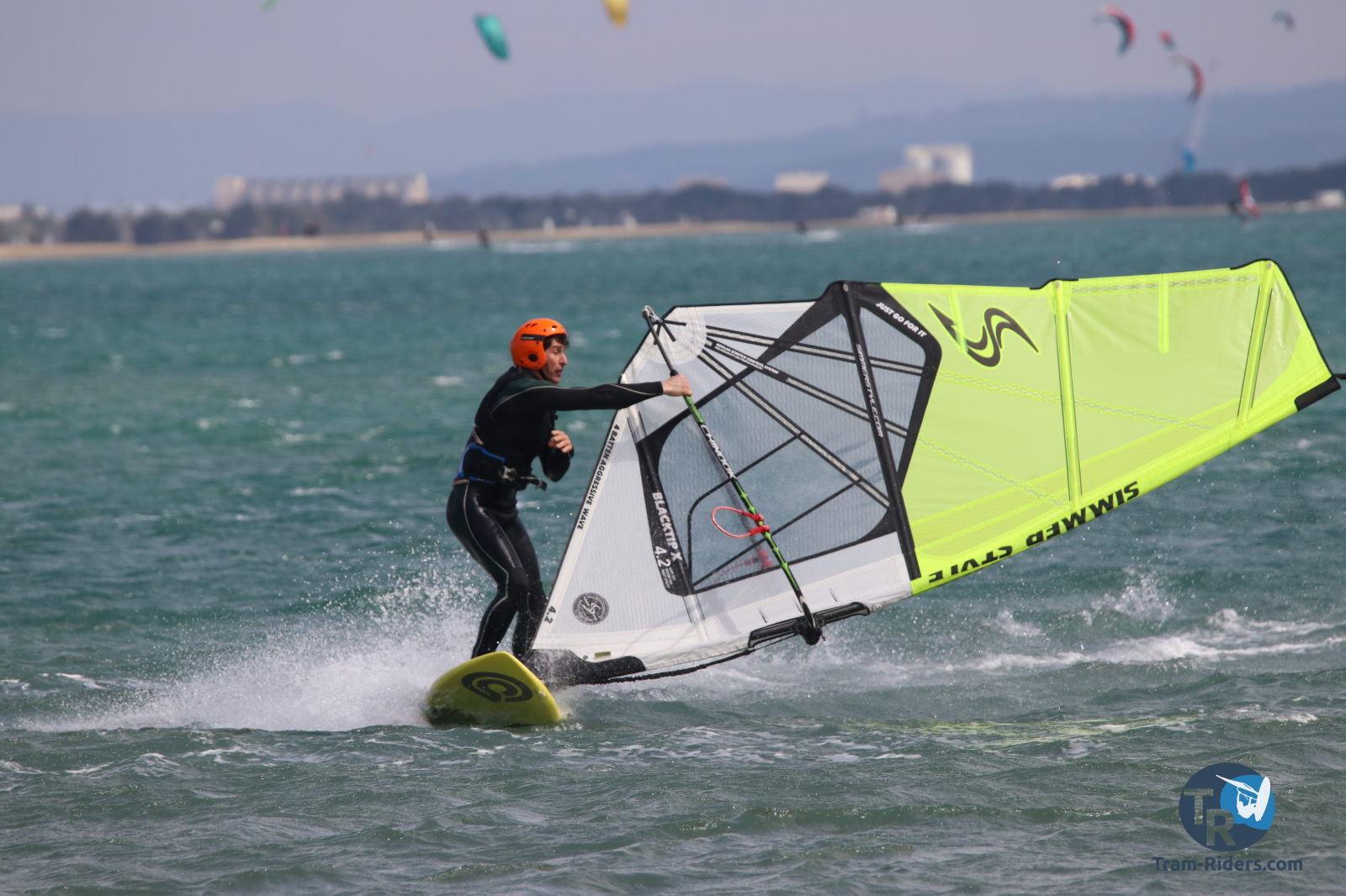 Et puis sur la fin de journée, les conditions se sont pas mal améliorées : retour du vent bien puissant avec des pointes à presque 40 noeuds, plein ouest. Nous en avons vu quelques uns se gaver plein largue à deux mètres de la plage sur un plan d’eau super lisse. Et pour une fois, ils n’avaient pas le profil de d’un Casimir monté sur un cure dent et suspendu à une voile à 18 cambers en train de serrer les dents en murmurant « snel snel, Ik zal de snelste !! » (Il y a aussi la version italienne qui existe )